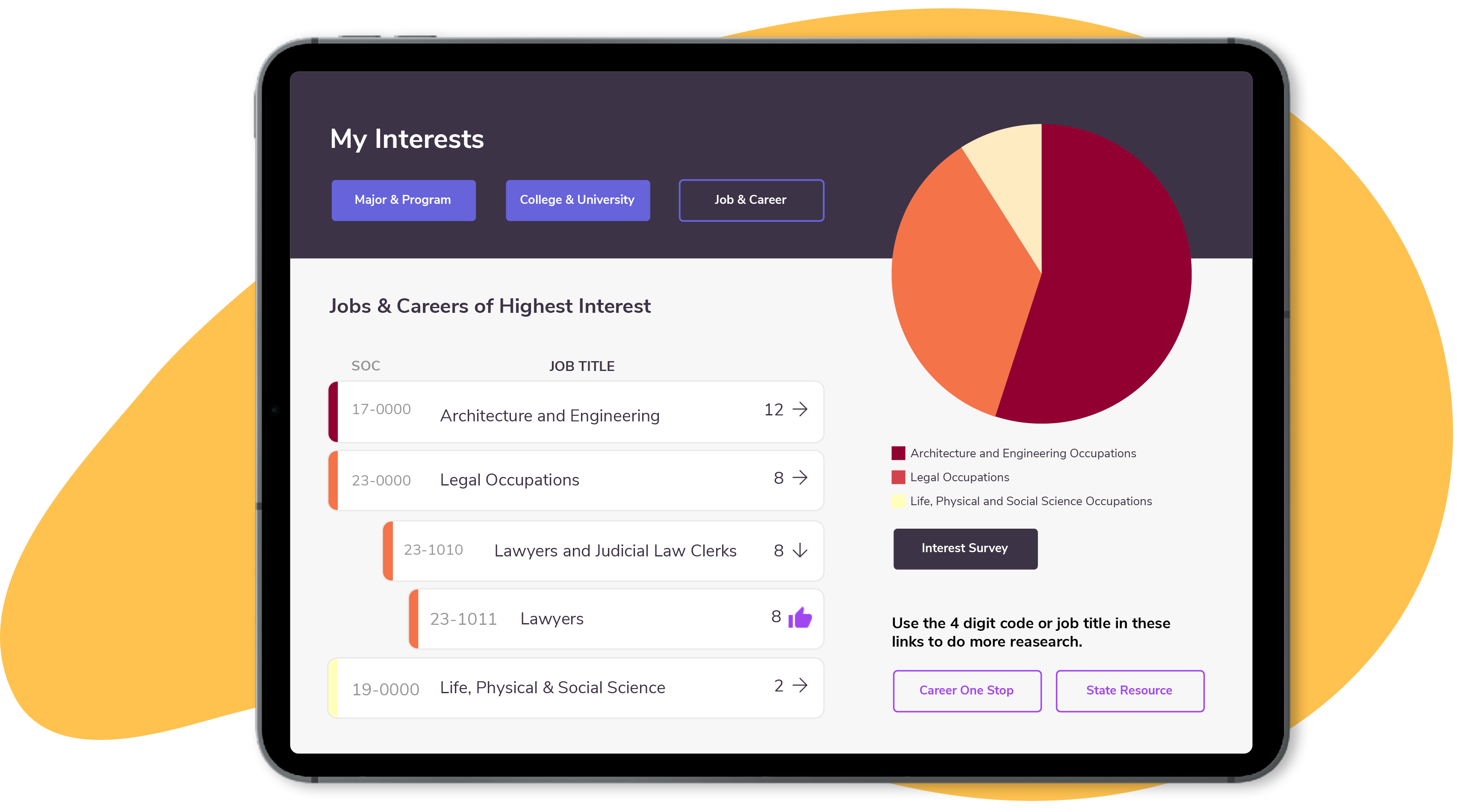 Our smart quiz starts by broadening young people's knowledge of what is possible, exposing them to all the ‘families of majors’ they could pursue. Learners rank their interest as they explore resulting in more personalized content.
